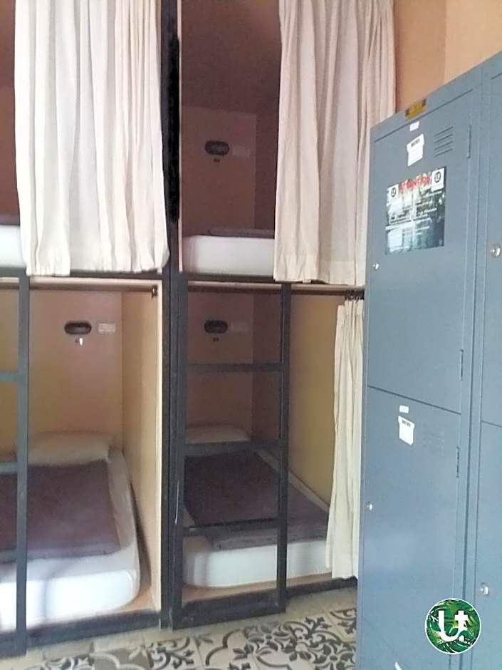 This bed in dormitory has a kitchen, kitchenware and seating area.